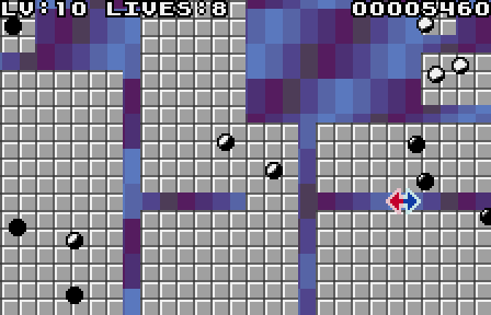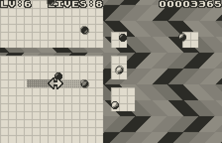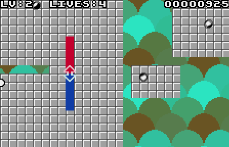 The divider lines will fire out in both directions either horizontally or vertically from the cursor and they will move until the edge of the screen or an existing solid area is hit. The divider line will become solid and any areas which don't contain a quark will also be filled in and become solid. If a divider line is hit by a quark, the line will be destroyed and you will lose a life.